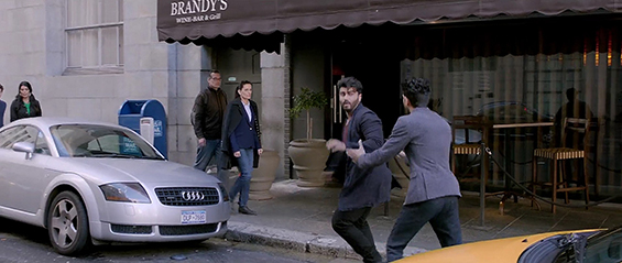 otsoNY Comments: Brandy's Wine-Bar is supposedly on Park Avenue near Grand Central Terminal. Though when the scene switches to outside of the wine-bar, the car park next to it has a foreign number plate and when the camera pans round to what should be Park Avenue, which it's not and the cars on the street behind the actors do not move because they are clearly not there.