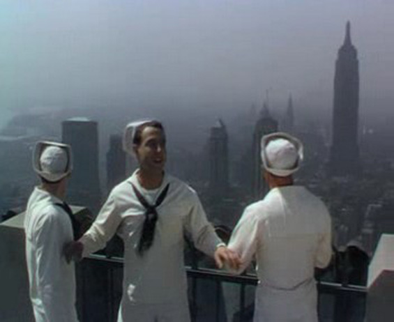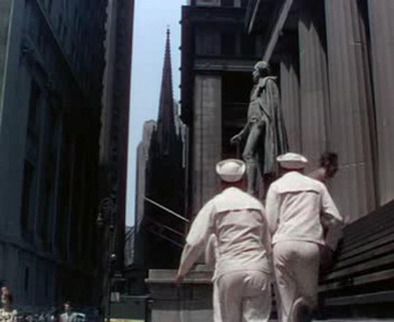 otsoNY Comments: Five days were spent in New York City filming. Whilst in New York, the film crew had to deal with the constent rain as well as the curious onlookers. To avoid crowds, the cast insisted on taxis instead of limousines for transportation and that the camera be hidden. During the finale of the "New York, New York" musical number, which takes place in the sunken plaza at 30 Rockefeller Plaza in front of the statue of Prometheus, you can see at the top of the frame of the last shot, the heads of hundreds of curious spectators staring at the three stars over the wall behind the statue.