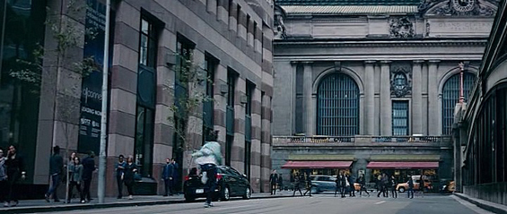 otsoNY Comments: It might look like the main character is running towards Grand Central Terminal on Park Avenue, but the building to his left is not actually in New York City, and this part of Park Avenue slopes downwards towards 42nd Street, whereas in this shot, the road is flat. Another clue is that the black car parked on the left hand side is pointing towards Grand Central Terminal, though this part of Park Avenue, the traffic actually flows in the opposite direction.