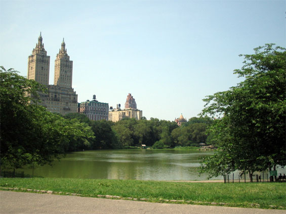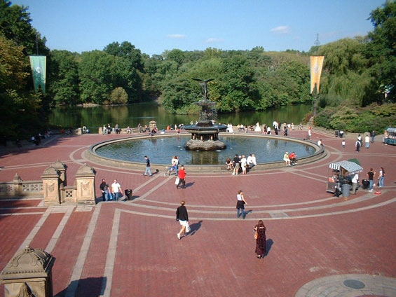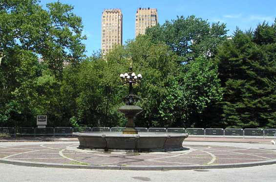 otsoNY Comments: Cherry Hill offers a Bethesda Terrace experience in miniature. From the rise of Cherry Hill, you also can see across the Lake to the Ramble. And the Cherry Hill Fountain serves as a decorative arts destination in its own right. Jacob Wrey Mould, Calvert Vaux's assistant, designed the decorative elements for Bethesda Terrace in 1859, and in 1860 the fountain at Cherry Hill with its ornamental finial on the top, the gilded cups brimming over with water, the frosted glass globes for lighting, a sculpted bluestone basin inset with Minton tiles — all in the service of a watering trough for horses. Cherry Hill was intended to be a scenic turn-around for carriages, a place to admire the surrounding cherry trees in springtime bloom and take in the lakeside view.