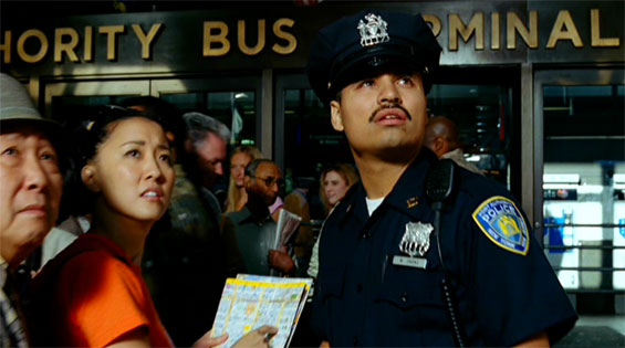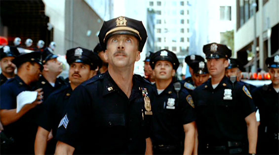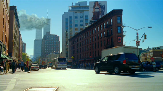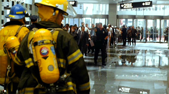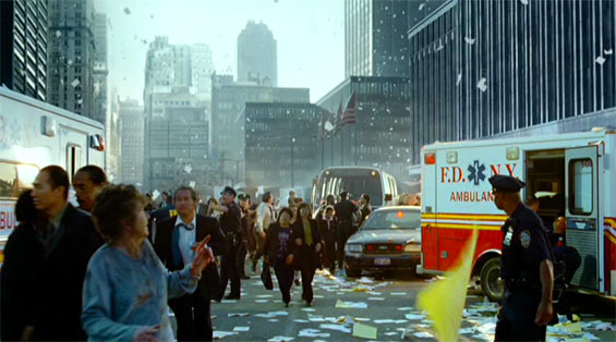 otsoNY Comments: The city of New York absolutely prohibited the recreation of 9/11 destruction or chaos on location. The filmmakers were not even allowed to film actors looking upward toward where the towers would be. The drive of the officers up to the site was permitted to be filmed, but all scenes depicting events at or near the WTC were filmed in Los Angeles.